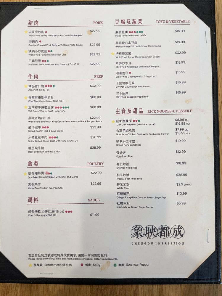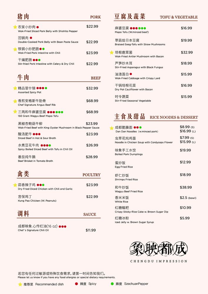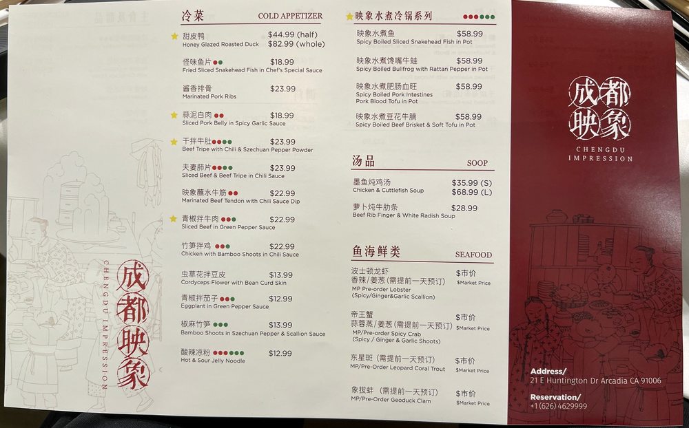 Chengdu Impression is a trendy and upscale Szechuan restaurant located in Arcadia, CA. It offers a wide range of authentic Chengdu cuisine, with options for vegans and vegetarians. The menu includes dishes like lobster, fatty duck, sweet and sour fish, mapo tofu, and crispy spicy diced chicken, all prepared with a modern twist. Customers have praised the friendly service and stylish interior of the restaurant. The spicy dishes are not overwhelming, making it a great introduction to Szechuan cuisine for newcomers. However, be cautious with the spice level, as some dishes can be spicier than usual. Prices are on the higher side, with sides starting at $16 and entrees around $30. Overall, Chengdu Impression is a must-visit destination for anyone craving authentic and flavorful Chinese food with a modern twist.